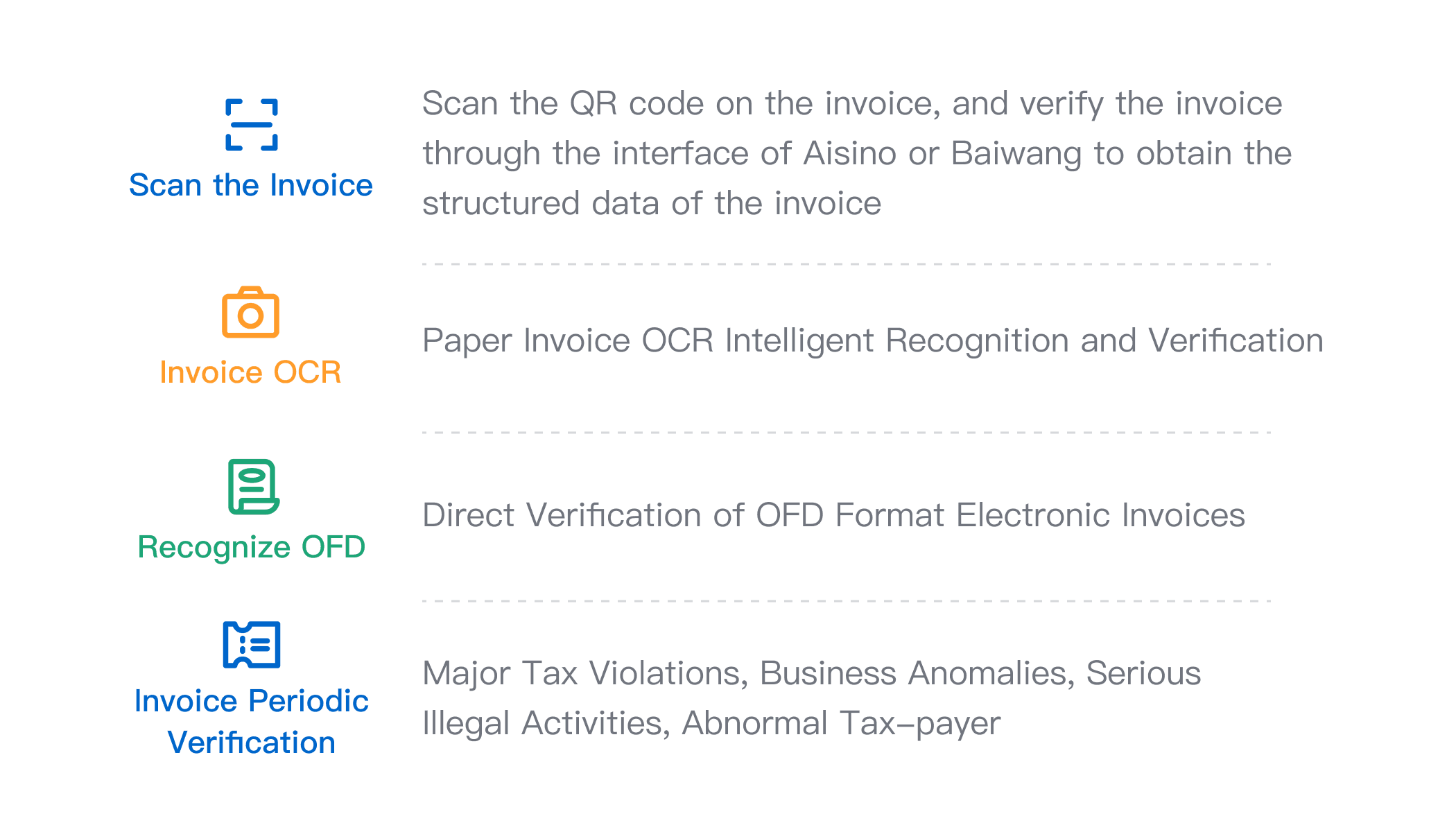 支持解析数电票(含XML格式的数电票原文件)和读取OFD/PDF/纸质版发票信息,并查重、验真、验签及监控发票异常状态,规避合规风险